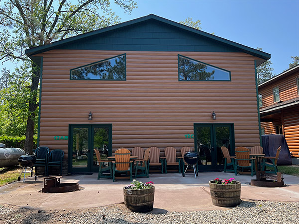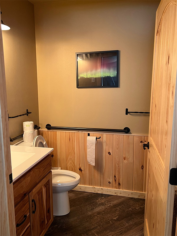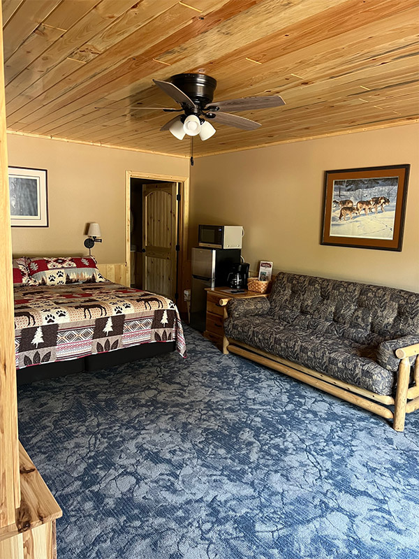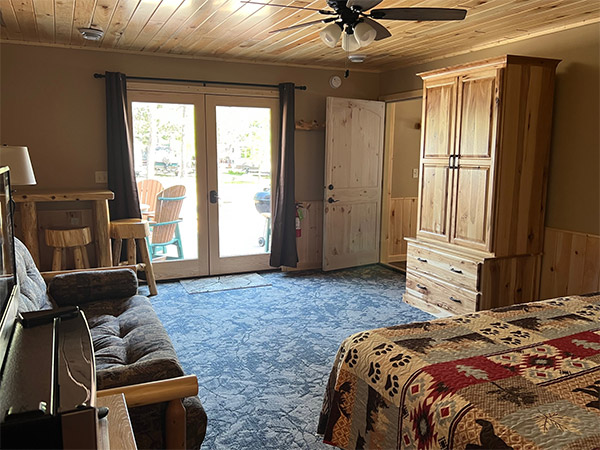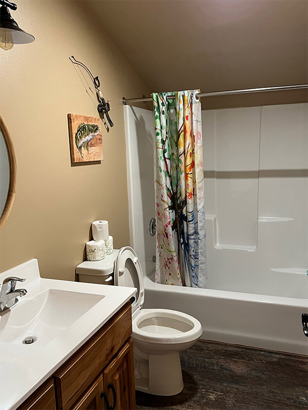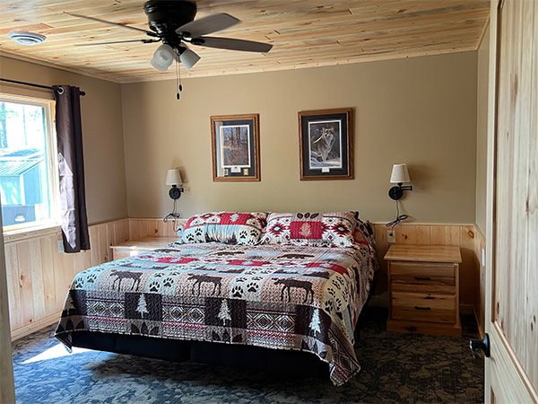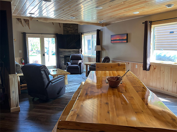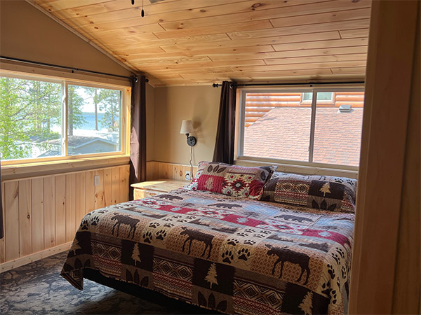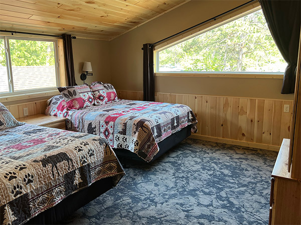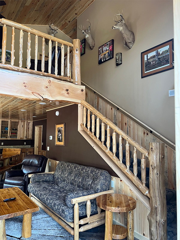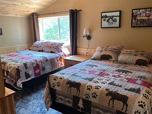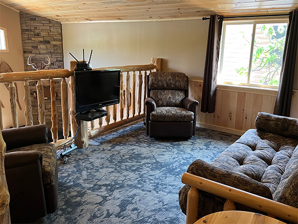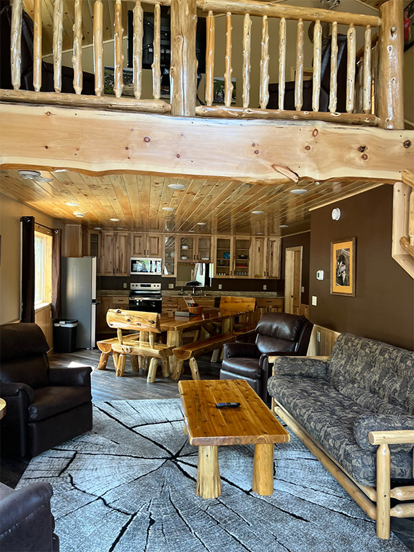 Cabin #12 is a 5 bedroom, 3 bath cabin that can sleep up to 20 people. It has two bedrooms and two bathrooms on the main level with a King size bed in each bedroom and two futon couches one in the master bedroom and one in the living room. Upstairs there are 3 bedrooms and one bathroom and a balcony area with another futon couch. Two of the upstairs bedrooms have two queen beds in each bedroom and the third bedroom has a king size bed.