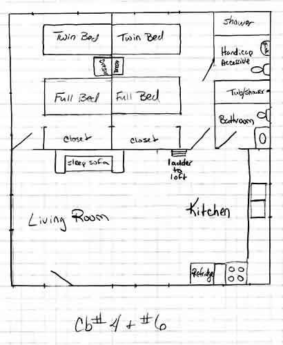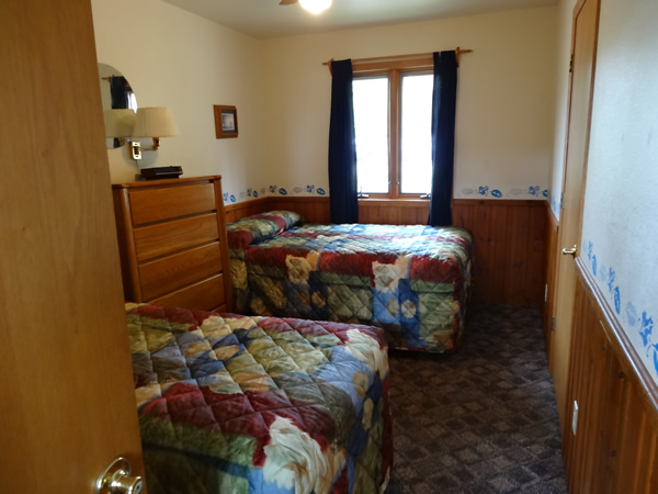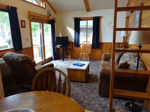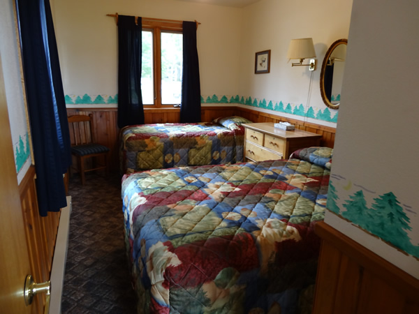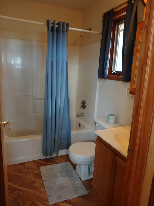 This nicely remodeled lakefront, two-bedroom cabin with two bathrooms sleeps up to 8 people comfortably. Your vacation cabin offers a fully equipped kitchen with a full-size refrigerator, range, microwave, coffee maker, toaster, and eating utensils. The cozy living room is nicely carpeted with a color TV for your enjoyment. The private bathroom is handicap accessible with a roll-in shower stall. There’s also a handicap accessible lakeside deck with lawn chairs and table plus a picnic table, fire ring with grill and a charcoal grill.